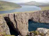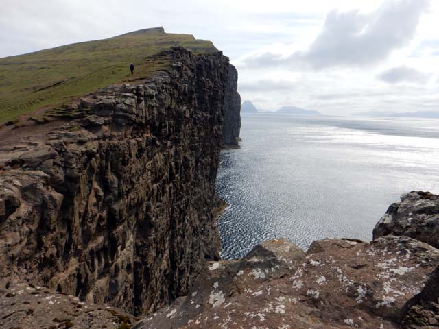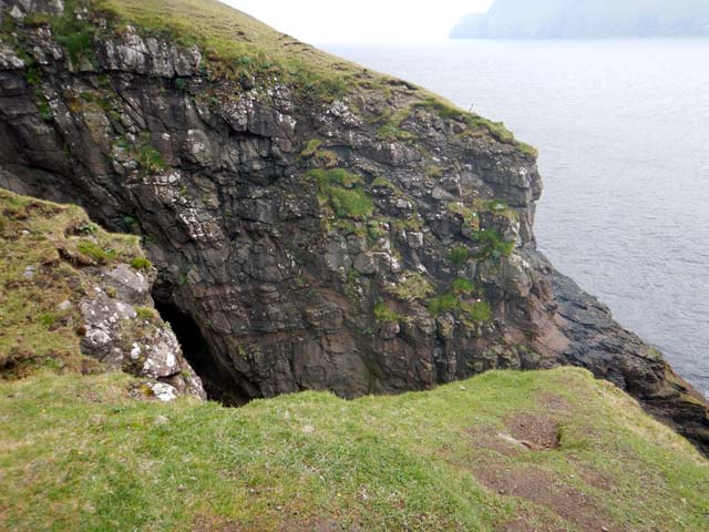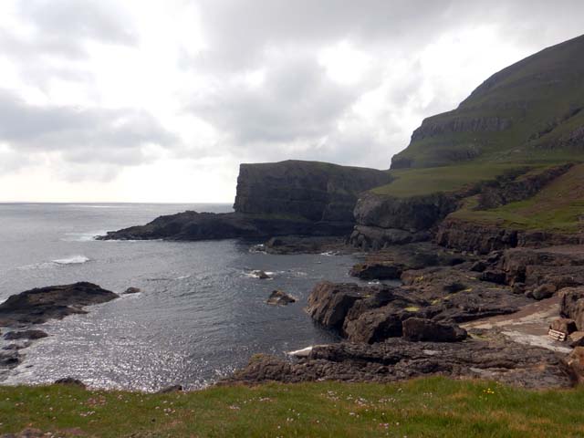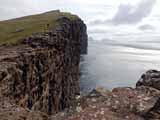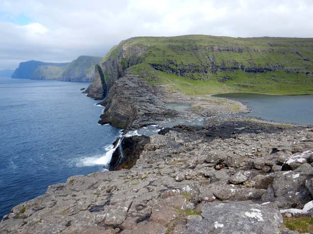 もう少し先に歩いて行くと細長い湖の先端に出て、小さな滝Bøsdalafossurとなって海に注いでいる。それほどの高低差は感じない。その先は断崖絶壁Geituskorardrangurが続いている。