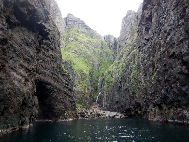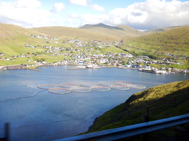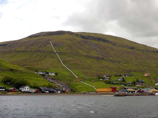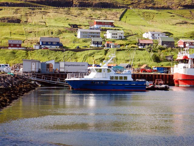スウロイ島(Suðuroy)の入江にあるTrongisvágur近くの港に着岸。周りの景色には柱状節理が目立つ。フェロー諸島は現在活火山がないものの火山による岩でできた島で、南側が隆起していると言うことで、スウロイ島(Suðuroy)はフェロー諸島の中で古い岩石が露出しているとのこと。
