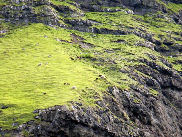 スウロイ島(Suðuroy)までには2つの小さな島を通過する。Lítla Dímunという小さな島は東京都の御蔵島のようなお椀を逆さまにしたような島で、個人が所有し、羊が飼われている。
