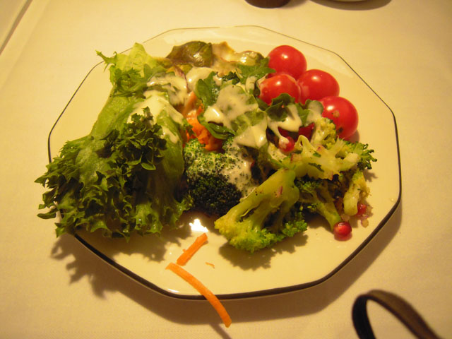アイスランドをまわってから到着した2011年8月22日(月)、町の中心部のPEDER OXEという店で夕食。野菜サラダは自由にとる形式で、普段はあまり野菜は食べないのに、たっぷりと食べた。アイスランドではやはり野菜は乏しいので、がつがつと食べてしまった。