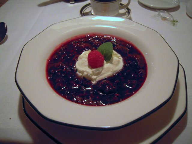 さらにデザート。どれにしようかと思ったが、デンマークの伝統的なデザートだということで、Rødgrødというものを頼んだ。ウェイトレスに笑顔で"Good Choice!"と言われたが、これ、ベリーを甘く煮込んだもので、本当にとてもおいしかった。