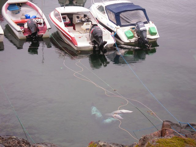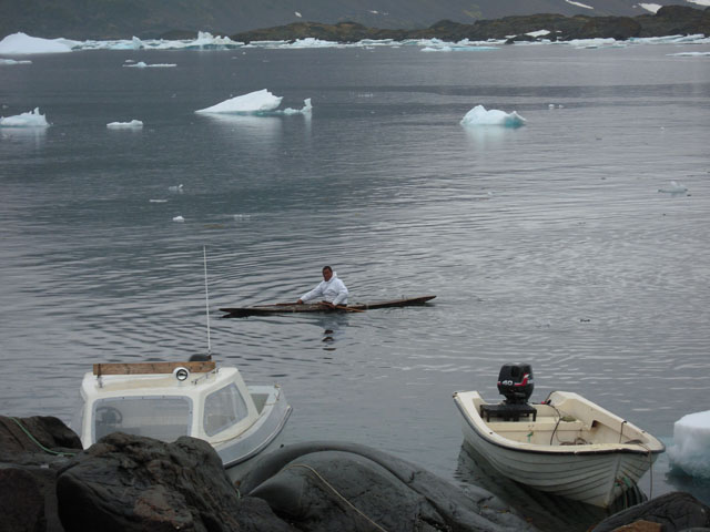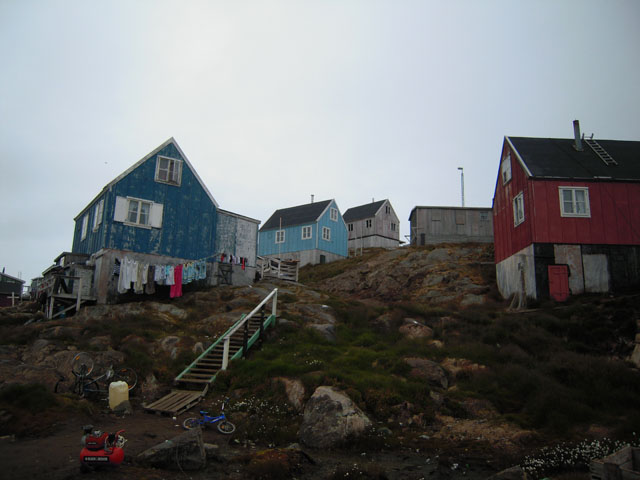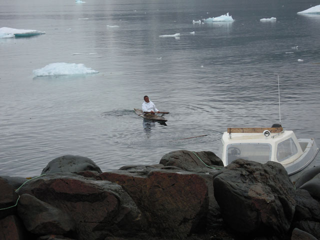 村の入口には小さな港があり、小さなボートが停泊している。海の中には捕獲したアザラシか何かがロープに結びつけられている。